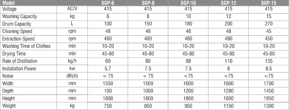 The SGP Series Perc Dry Cleaning Machines are designed for effective removal of tough stains from all types of fabrics. Each unit features a dedicated chemical storage system, efficient filtration, and a reliable cooling mechanism to ensure superior cleaning results. The advanced programmable controller allows easy operation with multiple cycle selections for different fabric types. Built with a high-speed, energy-efficient motor and enhanced ventilation system, the SGP Series ensures smooth, safe, and eco-conscious performance with minimal maintenance.